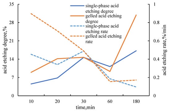 The experimental results show that when the acid immersion time is less than 30 min, there is a significant difference between the acid etching reaction rate and acid etching degree of gelled acid and those of single-phase acid. The former was about twice the latter. However, with the increase in acid–rock reaction time, the difference gradually decreased. When the acid immersion time was greater than 30 min, although the difference was not significant, the acid etching rates of both single-phase acid and gelled acid decreased significantly. From the perspective of chemical reaction kinetics, in the initial reaction stage, the acid concentration was relatively high, and the chemical reaction rate was mainly affected by the contact area between the acid solution and the rock surface and the number of active sites. Due to its viscosity characteristics, gelled acid stayed on the core surface for longer, increasing the effective contact area, so the reaction rate and degree were higher. As the reaction proceeded, the acid concentration decreased, and the reaction was gradually controlled by diffusion. At this time, the diffusion rates of the two acid solutions gradually approached, resulting in the reaction rate and degree also tending to be similar. A comparison of the acid etching results of single-phase acid and gelled acid at different times is shown in Figure 4.