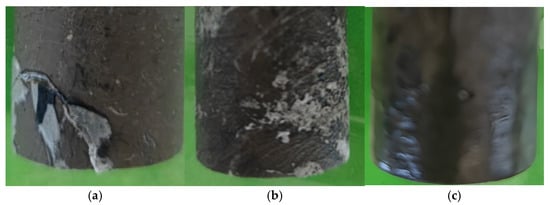 In the experiment of this study, it was found that the acid solution used showed unique etching characteristics on the tight limestone samples. For single-phase acid it mainly exhibited a selective etching mode during the reaction with limestone. Some easily soluble mineral components were preferentially dissolved on the limestone surface, while some relatively insoluble minerals remained, resulting in a microscopically uneven structure on the rock surface or the peeling of the rock epidermis. It could be seen that calcite crystals were preferentially dissolved, and the remaining relatively insoluble minerals, such as quartz, formed protrusions. In the initial reaction stage, the acid etching reaction near the tiny, dissolved pores on the core surface was relatively intense. Over time, the acid solution gradually penetrated the core. However, due to the limitations of the ultra-low permeability and porosity of the tight limestone, the distribution of the overall etching degree showed an obvious gradient change. The etching in the acid immersion area was relatively severe, while the etching degree in the deep area away from the surface was relatively weak. The morphology of the core fracture surface after single-phase acid etching is shown in Figure 6.
