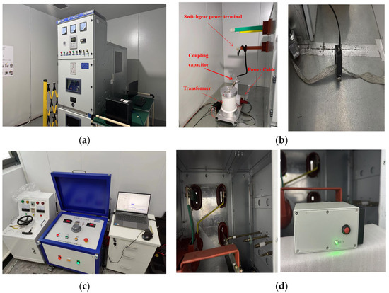 Figure 1, is designed to simulate and capture ultra-high-frequency (UHF) signal data under various defect conditions. The platform comprises four main components: (1) a control console, (2) a high-voltage transformer, (3) a high-frequency current transformer (HFCT, Model SH-JF-60, Shanghai Jufeng Electric Automation Co., Ltd., Shanghai, China), and (4) UHF signal acquisition equipment.