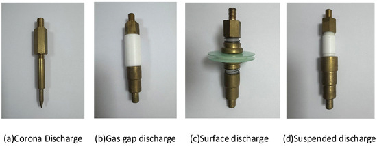 In this experiment, four defect models are designed to simulate cable faults: corona discharge, void discharge, floating discharge, and surface discharge. Additionally, a control group without partial discharge is included for comparison. Corona discharge occurs when the electric field intensity at the electrode tip exceeds the dielectric breakdown strength, leading to air molecule ionization. Floating discharge and void discharge arise from electric field distortion caused by suspended metal particles or bubble movement between electrodes. Surface discharge occurs when the tangential electric field at cable ends or rough surfaces surpasses the tangential breakdown voltage of the dielectric. The four defect models constructed for the experiment are depicted in