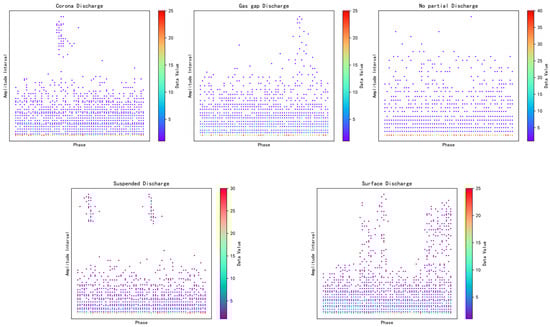 Figure 3. The resolution of the maps is 515 × 389, with the horizontal and vertical axes representing the phase of a single cycle and the normalized amplitude range, respectively. All acquired signals are converted into PRPD maps, and the number of maps for each type is recorded. In total, 1426 PRPD maps are obtained in this experiment, with the distribution of each type listed in