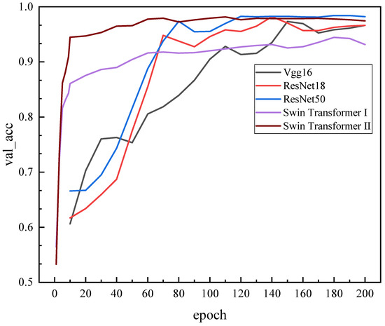Figure 8. It is easily found from this figure that the two Swin Transformer models, during the early stages of training, exhibit a rapid increase in pattern recognition accuracy, reaching 85% and 94.68% at epoch 20, respectively. At the end of the training, the proposed Swin Transformer II achieves a recognition accuracy of 97.52%, second only to the 98.19% accuracy of the ResNet50 residual network. Additionally, as the network depth increases (e.g., ResNet152, Vgg16), the recognition accuracy of Convolutional Neural Networks (CNNs) tends to decrease. This may be due to the relatively small dataset in this experiment, where a lightweight network is sufficient to fit the data well. This suggests that simply increasing the number of layers in a neural network does not always improve recognition accuracy, while it sacrifices computational efficiency. Therefore, choosing the proposed Swin Transformer II as the neural network for partial discharge pattern recognition training has the advantages of fast convergence and relatively high accuracy.