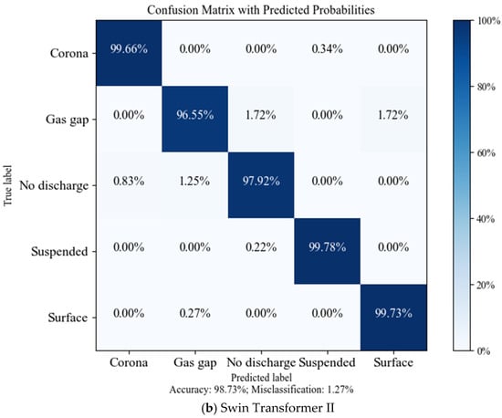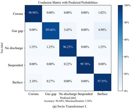 Figure 9. It can be seen from this figure that in Swin Transformer I, 1.02% of the maps, which are actually corona discharge, are misclassified as surface discharge, while 2.18% of surface discharge maps are misclassified as corona discharge. This indicates that Swin Transformer I does not fully learn the features of maps with strong similarities. Similarly, surface discharge and no partial discharge cause significant interference in the identification of gas gap discharge. By introducing learning rate adaptation in Swin Transformer II, key features from various partial discharge maps are effectively captured, reducing the error rate. For example, in the proposed model, when identifying gas gap discharge, only 1.72% are misclassified as no partial discharge or surface discharge. It can be observed that the improvements in feature extraction in Swin Transformer II led to varying degrees of improvement in the recognition rates for all discharge types, except for floating discharge.