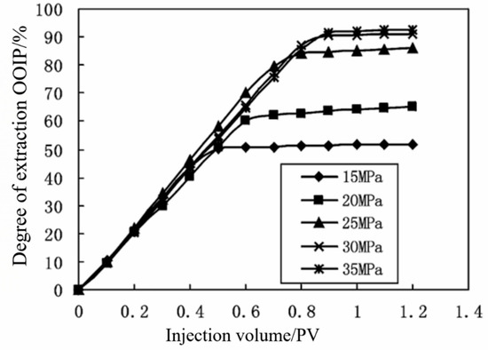Guo Qingan et al. [8] conducted thin tube experiments on heavy oil in the Yaoyingtai low-porosity and ultra-low permeability oilfield under formation temperatures of 89.7 °C, with pressure points of 15, 20, 25, 30, and 35 MPa. The recovery rates after CO2 injection were 51.90%, 65.09%, 85.98%, 91.21%, and 92.56%. The results of testing the variation in recovery rate with different injection pore volumes under different displacement pressures are shown in Figure 1. The simulation results show that the higher the injection pressure of CO2, the better the oil displacement effect and the more significant the increase in recovery rate. This indicates that the injection pressure of CO2 is one of the key factors affecting its oil displacement efficiency, providing important pressure parameter references for the application of CO2 oil displacement technology in similar reservoirs. The relationship curve between CO2 injection pore volume and recovery rate under different pressure conditions is shown in Figure 1.