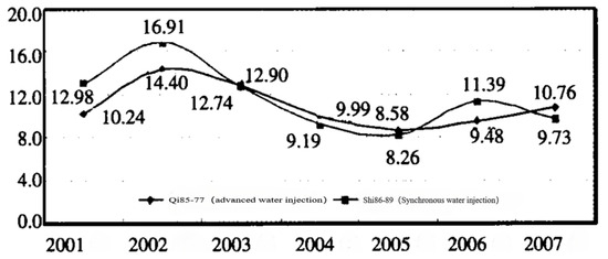 Hongwu Xu et al. [32]. adopted a synchronous water injection method in the production block of Sulun Nur oilfield, which was put into operation 6 months later. This reflects the problems of low single-well production, low oil recovery intensity, low oil production rate, fast production reduction rate, fast formation pressure drops, and a high proportion of low-efficiency wells in the early stage of production (Table 2), and the development effect is relatively poor. Through advanced water injection development, the injection production relationship between oil wells and water wells has been established, with an initial increase in single well production and a decrease in initial decline, resulting in improved development efficiency. Various issues in the early stages of production are shown in Table 5.