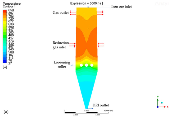 The temperature cloud map inside the hydrogen-based shaft furnace shows (a) the absence of the cooling effect, (b) the cooling effect with only the loosening roller added, and (c) the loosening roller with the cooling effect and the addition of cooling plates in the cooling section.