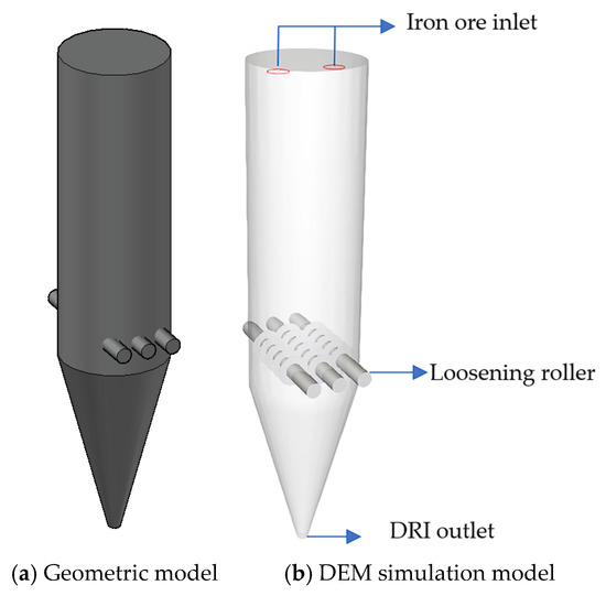 The geometric model established for the newly developed hydrogen-based shaft furnace is shown in Figure 2, in which the complex cooling gas input and output components are replaced by the combining loosening rollers and cooling plates in the cooling section. The cooling section of the traditional MIDREX furnace is a very complex process stage, in which the cooling gas is input into the cooling section by a compressor and passes through a loosening roller. The loosening roller is connected to the cooling gas collection hood, distributor, washer, and dryer of the cooling section to cool the DRI. This study designs a new hydrogen-based shaft furnace, in which the cooling section simplifies the structure of the loosening roller, ensures its cooling capacity, and can smoothly lower the DRI. In order to save computing resources and simplify the construction of the cooling section of the hydrogen-based shaft furnace, a simplified version of the hydrogen-based shaft furnace model was designed. In order to save computing resources and simplify the structure of the cooling section of the hydrogen-based shaft furnace, a simple hydrogen-based shaft furnace shell with an upper cylindrical body and a lower rounded platform was designed during the CAD modeling process. Three cylindrical bodies with fan blades were added as loosening rollers in the transition section, with the fan blades staggered and spaced at the same interval. Then, the Ansys Rocky 22.1.0 simulation software was imported to generate a hydrogen-based shaft furnace model, add feeding and discharging ports, set the feeding speed, loosen the roller speed and other parameters. As only the dynamic wear effect on the hydrogen-based shaft furnace is considered, other thermodynamic influence parameters such as temperature are not set. The particle motion process is simulated through the DEM model provided by the simulation software. In order to accelerate the simulation process, optimize resource utilization, reduce computational burden, and improve overall computational efficiency, the following assumptions were made for hydrogen-based shaft furnaces: