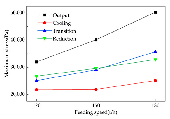 Stress distribution of loosening rollers with different feeding speeds.