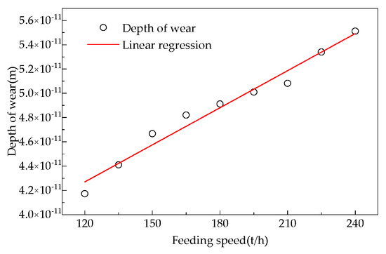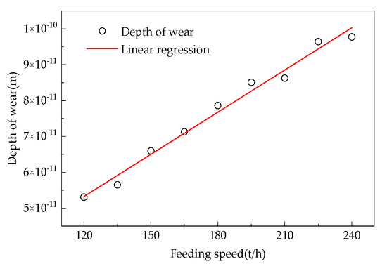 Based on the eccentric wear mechanism and Archard wear theory of the loose roller shown in Figure 14, Figure 15 and Figure 16, as well as the relationship between the feeding rate and the degree of furnace wall wear in Figure 18, the Formula (7) for the wear degree of the loose roller is obtained as follows: