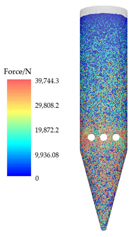 Figure 11 shows the force cloud map of iron ore pellets with a feeding rate of 150 t/h. From the figure, it can be seen that the force on the pellet particles increases with depth, which is consistent with physical principles. The loose roller compression causes the transition section to directly reduce the iron and bear the maximum stress, followed by the core pellet located 2.26 m below the material surface. The force on the DRI in the cooling section is reduced due to the loose roller support, while the force on the output section is minimized due to the output of furnace materials, as shown in Figure 12. Observing the cloud map of particle stress, it was found that high stress particles are mainly concentrated around the loose roller and above the discharge port, which is attributed to the intense movement of particles in these areas leading to strong forces between them.