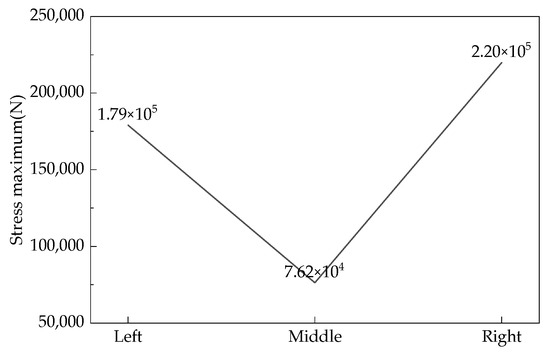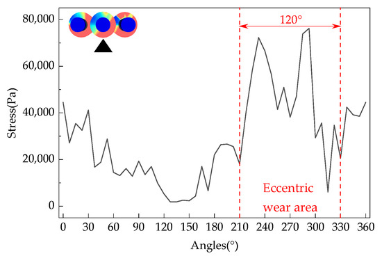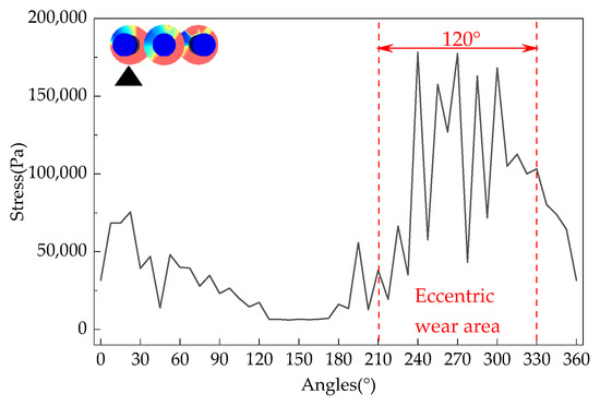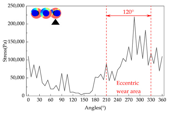 The loose roller group with a feeding speed of 150 t/h was selected as the research object. The maximum force on the fan blades of each loose roller at various angles in the circumferential direction is shown in Figure 14, Figure 15 and Figure 16. The maximum force on the fan blades of each loose roller fluctuates greatly and is the largest in the range of 240°~315°, while the force is the smallest in the range of 120°~180°. Uneven force distribution is determined by the angle of the loose rollers when the hydrogen-based shaft furnace starts operating. During the rotation process, the uneven force distribution on the loose rollers gradually leads to irregular shape changes, resulting in more severe eccentric wear due to deformation. From Figure 17, it can be seen that the maximum shear stress on the right loosening roller is 219,896.1 Pa. This is due to the clockwise rotation of the loosening roller driving nearby DRI particles to move to the right, resulting in the maximum stress on the loosening roller in the right loosening roller and local stress concentration. The reason why the middle loose roller experiences the least stress is because there is a structural difference between the middle loose roller and the outer loose roller, and more blades result in the least stress.