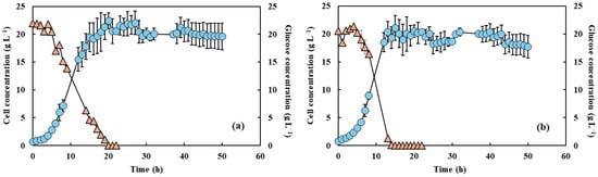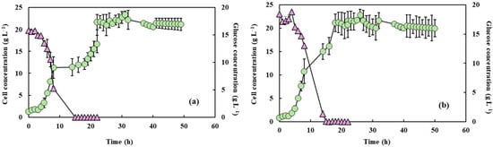 Cell concentration (light green circles) and glucose consumption (light purple triangles) of Y. lipolytica grown in 2 L bioreactor (working volume 1.5 L) in YPD medium and aeration of 1.5 L min−1 with PFC and with shaking at 550 rpm (a) and 650 rpm (b).