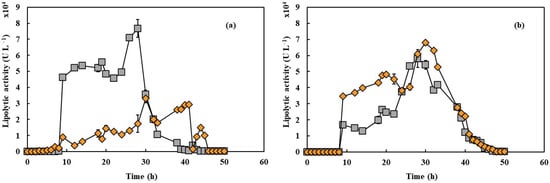 Lipase activity during cultivation of Y. lipolytica in 2 L bioreactor (working volume 1.5 L) in YPD with aeration of 1.5 L min−1 in absence (a) and presence (b) of PFC under shaking speeds of 550 rpm (orange diamonds) and 650 rpm (gray squares).