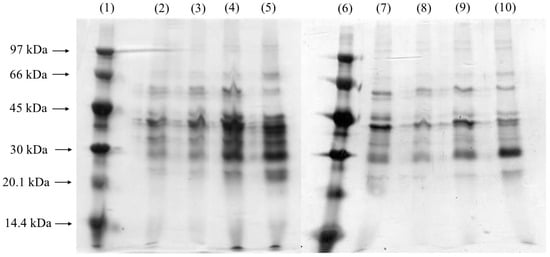 Silver-stained SDS-PAGE gel of samples with PFC. Lanes 1 and 6 are low-molecular-weight markers. Lanes 2 to 5 refer to 18, 20, 22, and 24 h of fermentation at 550 rpm, respectively; Lanes 7 to 10 refer to 18, 20, 22, and 24 h of fermentation at 650 rpm, respectively.