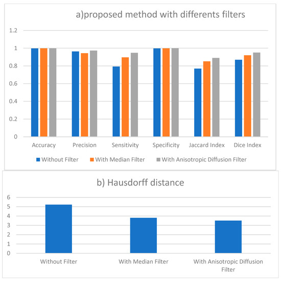 (a) Performance measures of proposed method results without filter and with two different filtering. (b) Results of Hausdorff distance for segmentation with different filters.