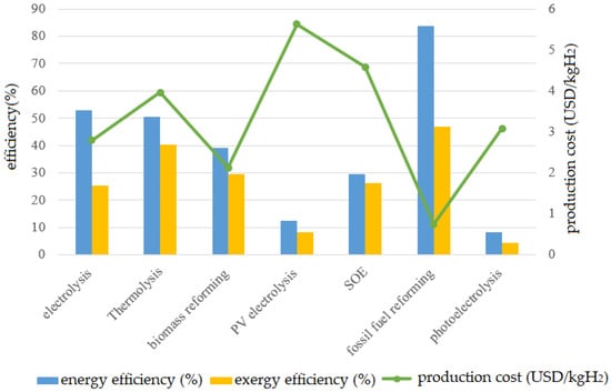Energy and exergy efficiency and production costs (in dollars per kilogram of hydrogen) for all methods.