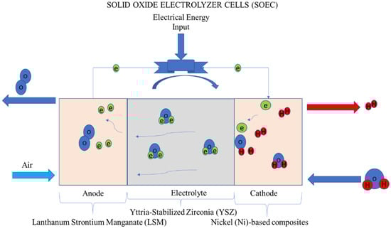 At the anode, the oxide ions (O2−) undergo further reduction to produce oxygen and electrons. The generated oxygen is released from the anodic surface, while the electrons travel through the external circuit back to the cathode due to the positive attraction of the cathode. The cathode is typically made of a porous nickel–yttria-stabilized zirconia (Ni-YSZ) cermet, while the anode is usually a perovskite material such as lanthanum strontium manganite (LSM) [37,38,39]. The solid oxide electrolyte, which is the heart of the SOECs, is a dense ceramic material, most commonly yttria-stabilized zirconia (YSZ), that conducts oxygen ions at high temperatures. During operation, steam is introduced to the cathode side of the SOECs, where it is converted into hydrogen gas and oxygen ions. The oxygen ions then move through the solid oxide electrolyte to the anode side, where they combine to produce oxygen gas [40,41,42,43]. A general schematic of the equipment and operation of SOECs is shown in Figure 3.