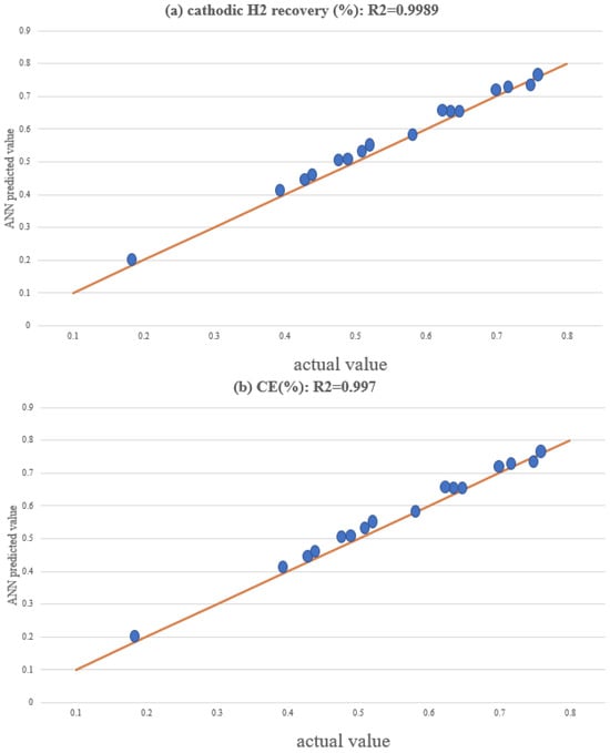Correlation coefficients of the models developed using the Levenberg–Marquardt training algorithm for (a) cathodic hydrogen recovery and (b) current efficiency (CE) [66].