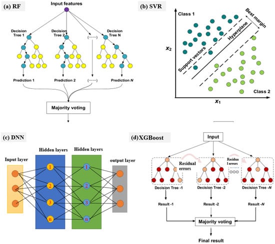 Schematic diagram of four ML models: (a) RF, (b) SVR, (c) DNN, and (d) XGBoost [75]. (a) RF is a tree-based ensemble learning model with the bagging approach, (b) the SVR method is widely employed in regression analysis, wherein it projects data onto a high-dimensional space to identify a hyperplane that minimizes sample errors within a specified range, (c) the DNN algorithm is a computational model that simulates the biological nervous system, consisting of multiple neurons, each with an activation function, and capable of receiving input from other neurons, (d) the XGBoost algorithm is a ML algorithm based on gradient boosting trees to enhance the performance of weak base learners through stacking.