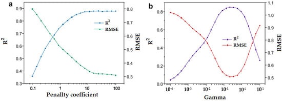 Optimization of the hyperparameters of the SVR [75]. (a) demonstrate that as the penalty coefficient increases from 0.1 to 74, the R2 of the SVR model rapidly increases while the RMSE significantly decreases, (b) as the gamma of the SVR model increases from 10−4 to 0.74, there is a significant improvement in the R2 value and a rapid decrease in RMSE.