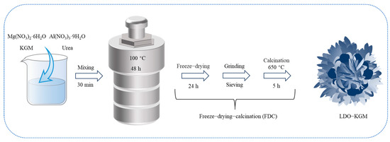 LDH was achieved through a simple one-pot hydrothermal process, utilizing urea as the alkaline agent, and then, LDO-KGM was synthesized according to the FDC method (Figure 1). Research showed that FDC was a widely used way to synthesize products with a porous structure, which could provide more active sites [32]. In detail, 0.008 mol Mg(NO3)2·6H2O, 0.004 mol Al(NO3)3·9H2O, 0.125 mol urea and x g KGM (x = 0.5, 1, 1.5, 2, 2.5) were added to a beaker containing 50 mL DIW, whilst stirring for at least 30 min until completely mixed. Subsequently, the homogeneous solution was poured into a 100 mL Teflon-lined autoclave for hydrothermal processing at a temperature of 100 °C over a period of 48 h. Following this, the resulting material was permitted to gradually cool to ambient temperature. The resulting precipitates were then centrifuged and washed with DIW to eliminate any residual free metals. The washing process was continued until the supernatant became colorless, and the pH of the solution reached approximately neutral, around pH 7. Finally, the precipitates were lyophilized at −60 °C in a freeze-dried machine and named LDH-KGM-x (X was the amount of KGM added), among which LDH-KGM-2 had the best adsorption capacity. The obtained LDH-KGM-2 was calcined at 250, 350, 450, 550, 650, and 750 °C, respectively, and named LDO-KGM-2-Y (Y was the calcination temperature). The calcination process was conducted in a muffle furnace, with the temperature ramped up at a rate of 5 °C/min. The material was then subjected to calcination at the designated target temperature for a period of 5 h. Following the calcination, the furnace was permitted to cool down naturally to ambient temperature. The final obtained material with the best adsorption properties was LDO-KGM-2-650, denoted as LDO-KGM. The MgAl-LDH and MgAl-LDO used for comparison were synthesized without adding KGM, where MgAl-LDO was synthesized through the calcination of MgAl-LDH at 650 °C.