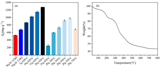 (a) Adsorption capacity of U(VI) by materials synthesized under different conditions (C0 = 100 mg·L−1, pH = 6.0, T = 293 K); (b) TGA curves of LDO-KGM.