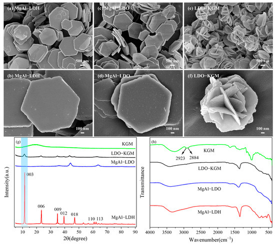 SEM images of (a,b) MgAl-LDH; (c,d) MgAl-LDO; (e,f) LDO-KGM; (g) XRD patterns; and (h) FTIR spectra of MgAl-LDH, MgAl-LDO, LDO-KGM, and KGM.