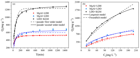 The excellent physicochemical properties of the successfully modified material with the greatly improved adsorption capacity for U(VI) were further demonstrated. Next, we continued to investigate the influence of reaction conditions on the immobilization capacity for U(VI). The efficiency of U(VI) immobilization was positively correlated with the dosage of the materials (Figure S2). Among the various materials, the dosage of 0.05 g·L−1 was more effective in immobilizing U(VI), and thus, this concentration was chosen for further study. As depicted in Figure 4a, each material exhibited a swift adsorption rate for U(VI) during the initial 180 min. The ranking of U(VI) immobilization capacities was as follows: LDO-KGM > MgAl-LDO > MgAl-LDH. To clarify the mechanism behind the immobilization of U(VI), we fitted the experimental data to both pseudo-first-order and pseudo-second-order kinetic models. The parameters obtained from the fitting are detailed in Table S1. The analysis revealed that for all materials, the pseudo-second-order model demonstrated superior correlation coefficients (R2 = 0.99) when compared to the pseudo-first-order model (R2 = 0.92), implying that the process of U(VI) immobilization was largely governed by chemical reactions [41,42]. Consequently, LDO-KGM demonstrates the capability to serve as a highly efficient adsorbent for the mitigation of U(VI) contamination events.