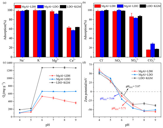 Considering the omnipresent nature of coexisting ions in natural water systems, the impact of diverse coexisting cations and anions on U(VI) adsorption by the prepared samples was explored (Figure 5a,b). As illustrated in Figure 5a, K+, Na+, and Mg2+ exhibited little influence on the adsorptive capacity of the MgAl-LDH, MgAl-LDO, and LDO-KGM. However, the adsorptive capacity of MgAl-LDH, MgAl-LDO, and LDO-KGM for U(VI) decreased by more than 40% in the presence of Ca2+. The decrease was likely because Ca2+ with the high valence was more prone to occupy the adsorption sites on the surfaces of materials [6], and the formation of CaUO2(CO3)32− complexes impeded the movement of positively charged uranyl ions (UO22+) to the adsorbent surface [49].