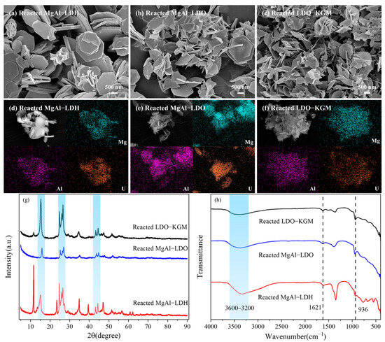 SEM and the corresponding EDS mapping of MgAl-LDH (a,d), MgAl-LDO (b,e), and LDO-KGM (c,f) after reacting with U(VI), Mg (cyan zone), Al (rose zone), U(VI) (orange zone); (g) XRD patterns and (h) FTIR spectra of MgAl-LDH, MgAl-LDO, and LDO-KGM after reacting with U(VI).