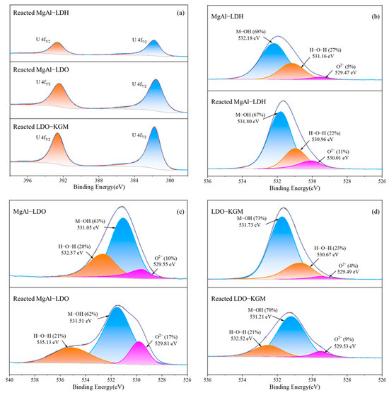 Figure 8b–d presented the O 1s spectra for three materials, both prior to and following the U(VI) immobilization. As illustrated in Figure 8d, LDO-KGM had three O 1s overlapping peaks at 529.49, 530.67, and 531.73 eV, which were ascribed to the vibration of O2−, H-O-H, and M-OH (where M represented Mg or Al), respectively [61,62]. During the reaction, M-O on the LDO-KGM surface was hydrolyzed to yield M-OH, which subsequently participated in surface complexation with U(VI), leading to the formation of M-O-U bonds. Therefore, after the reaction, the proportion of M-OH in the LDO-KGM decreased from 73% to 70%, and the relative abundance of O2− escalated from 4% to 9%. Following the adsorption of U(VI), alterations in the relative concentrations and positions of these O-donor functional groups were observed, with the binding energy of M-OH bonds shifting to lower values and that of H-O-H and O2− shifting to higher values. The reaction processes of MgAl-LDH and MgAl-LDO were similar to those of LDO-KGM. The findings substantiated that the oxygen-containing functional groups on the materials’ surface played a crucial role as enrichment and active sites for coordination with U(VI) during adsorption.