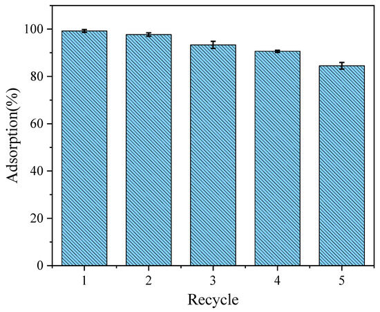 The reusability of adsorbents is an important factor for their practical application. Simultaneously, recycling adsorbents can save cost and reduce the waste of resources; therefore, it was also necessary to study the recycling performance of the adsorbents. On this basis, the reusability of the LDO-KGM was studied in five cycles of regeneration (Figure 9). During this process, the LDO-KGM were filtered out in the process of collecting the supernatants for the recycling experiments. Then, the collected LDO-KGM were eluted with hydrochloric acid of pH 3 and stirred for 24 h to desorb. After desorption, the LDO-KGM, which were restored to the state before adsorption, were repeatedly washed with DI water and then dried for the next adsorption experiment. After five cycles, the removal rates of LDO-KGM were 84.5%, which showed that LDO-KGM had good regeneration characteristics for the removal of U(VI).