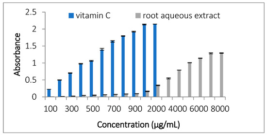 To assess the antioxidant potential, the iron-reducing capacity of vitamin C and root extract was evaluated. Figure 2 displays the dose–response curves for both samples, with the IC50 value representing the concentration needed to reduce half of the iron in the assay. The IC50 values obtained were 50.47 ± 0.34 µg/mL for vitamin C and 1132.35 ± 4.97 µg/mL for the root extract. Vitamin C showed significantly higher antioxidant activity than the root extract, as evidenced by its lower IC50 value (p < 0.05).