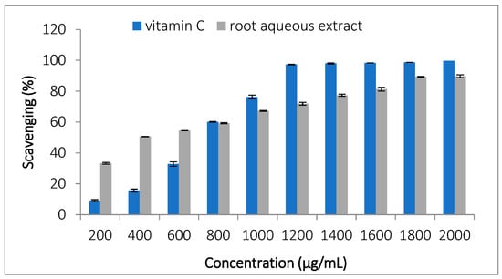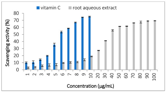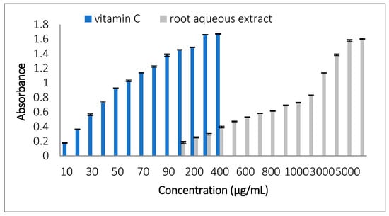 The DPPH scavenging activity was evaluated, and the results are presented in Figure 3. The IC50 values obtained were 6.29 ± 0.04 µg/mL for vitamin C and 34.43 ± 4.83 µg/mL for the root extract. Figure 3 shows the dose–response curves for both samples. Vitamin C exhibited significantly higher scavenging activity compared to the root extract (p < 0.05).