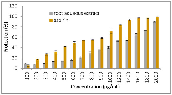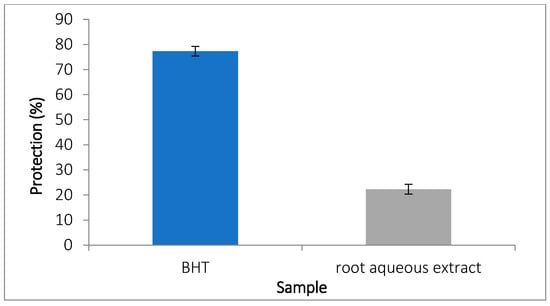 Linoleic acid peroxidation inhibition by the extract was assessed using the thiobarbituric acid method. The results, presented in Figure 5, show the percentage of protection against lipid peroxidation. BHT (1 mg/mL) provided the highest protection (77.36 ± 1.88%), followed by the root extract (22.32 ± 3.31%) (p < 0.05).