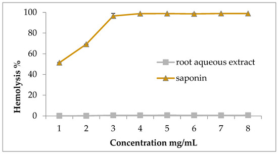 The toxicity of the extract was assessed in vitro, as described by Haddouchi et al. [21]. An amount of 0.1 mL of the extract or saponine (1 to 8 mg/mL) was mixed with 1.9 mL of 5% erythrocyte suspension. Tubes were incubated for 1 h at 37 °C, and then centrifuged at 700× g/5 min/4 °C. Distilled water was employed as a positive control for hemolysis, with PBS serving as the negative control. The supernatant’s absorbance was read at 540 nm, and the hemolysis percentage was calculated using the following equation: