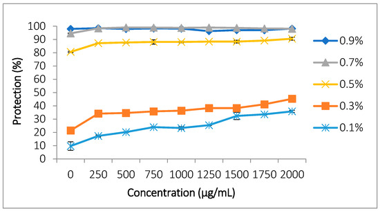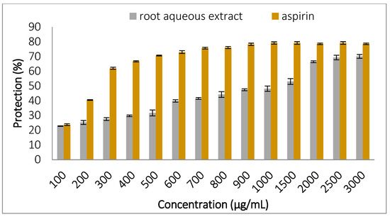 This study follows the protocol described by Suwalsky et al. [33] to test the extract ‘s ability to protect erythrocytes against oxidative stress induced by hypochlorous acid (HClO). An amount of 1 mL erythrocyte suspension (at 10%) was mixed with 1 mL of the extract or aspirin dissolved in PBS (100 to 2000 µg/mL). After incubation at 37 °C for 15 min, 0.05 mL of HClO (0.5 mM) was added, followed by a second incubation at the same temperature for 10 min. The mixture was centrifuged at 700× g/5 min/4 °C, and the supernatant’s absorbance was read at 540 nm. The percentage of protection was calculated according to Formula (7).