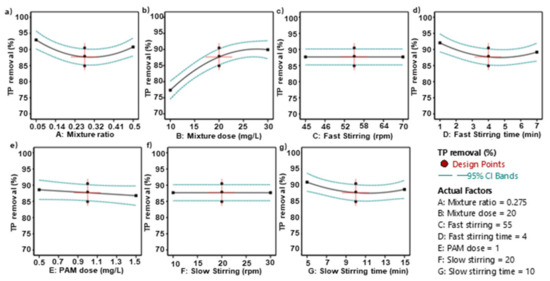 The effect of a single factor on the TP removal efficiency. (a) relationship between mixture ratio and TP removal; (b) the relationship between mixture dose and TP removal; (c) relationship between fast stirring speed and TP removal; (d) relationship between fast stirring time and TP removal; (e) relationship between PAM dose and TP removal; (f) relationship between slow stirring speed and TP removal and (g) relationship between slow stirring time and TP removal.
