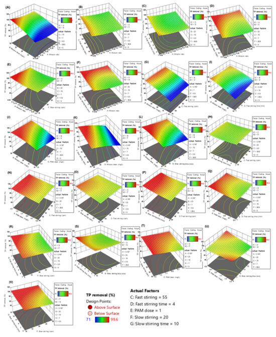 A 3D heatmap of the effect of two factors on the TP removal efficiency. (A) Effects of mixture dose and mixture ratio on TP removal; (B) Effects of fast stirring speed and mixture ratio on TP removal; (C) Effects of fast stirring time and mixture ratio on TP removal; (D) Effects of PAM dosage and mixture ratio on TP removal; (E) Effects of slow stirring speed and mixture ratio on TP removal; (F) Effects of slow stirring time and mixture ratio on TP removal; (G) Effects of mixture dose and fast stirring speed on TP removal; (I) Effects of mixture dose and fast stirring speed on TP removal; (J) Effects of Mixture dose and PAM dosage on TP removal; (K) Effects of Mixture dose and slow stirring speed on TP removal; (L) Effects of mixture dose and slow stirring time on TP removal; (M) Effects of fast stirring time and fast stirring speed on TP removal; (N) Effects of PAM dose time and fast stirring speed on TP removal; (O) Effects of fast stirring speed and slow stirring speed on TP removal; (P) Effects of fast stirring speed and slow stirring time on TP removal; (Q) Effects of fast stirring time and PAM dose on TP removal; (R) Effects of fast stirring time and slow stirring speed on TP removal; (S) Effects of fast stirring time and slow stirring time on TP removal; (T) Effects of PAM dose and slow stirring speed on TP removal; (U) Effects of slow stirring speed and PAM dose on TP removal, and (V) Effects of Effects of slow stirring speed and slow stirring time on TP removal.