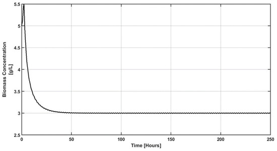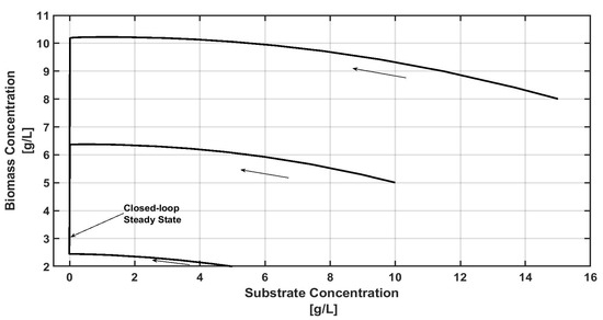 For a whole picture of the bioreactor’s behavior, a closed-loop phase portrait is shown in Figure 4. Here, the performance of the state variables under different initial conditions can be observed; notice that in all the cases, the controller leads to the control output (biomass concentration) being at the required set point (sp = 3 g/L), and all the trajectories arrive at the required set point across smooth curves.