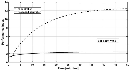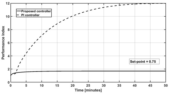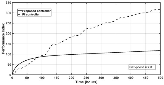 Performance comparisons of the proposed methodology and the PI controller, for the different set points considered as application examples, are shown in Figure 6, Figure 7 and Figure 8 for the corresponding set point values of sp1 = 3 g/L, sp2 = 2 g/L, and sp3 = 1.5 g/L, respectively. The mentioned comparison is performed via the performance index . It can be noticed that the proposed methodology has better performance, in all cases, than the PI controller.