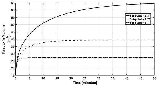 Figure 1 shows the closed-loop performance of the biomass concentration under the proposed controller. It can be noted that the proposed methodology can reach the distinct set points smoothly. Coupled with the first figure, in Figure 2, the control effort required for the proposed control law for each one of the corresponding set points is observed. Note that the controller is such that the volumetric flow converges during a longer-term operation time, when the required set point is related to a small concentration. This fact can be explained in the sense that the controller dilutes the biomass concentration via the inlet volumetric flow. This issue can be analyzed in Figure 3; indeed, because the control input is the inlet volumetric flow, the reactor’s volume increases due to the inlet volumetric flow. In other words, since the set point is related to small concentrations, in order to reach a biomass concentration of x2,sp = 1.5 g/L, the reactor’s volume in steady state is around 52 L; in contrast, for x2,sp = 2.0 g/L, the reactor’s volume in steady state is around 38 L, and, finally, when x2,sp = 3.0 g/L, the reactor’s volume in steady state is close to 28 L.