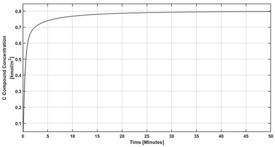 Figure 9 shows the closed-loop performance of the C concentration under the proposed controller for distinct arbitrary set points. Note the smooth response of the corresponding trajectories to reach the required set point concentrations; here, it can be seen that the proposed control law is able to regulate the reactor’s operations.