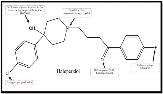 This study focuses on haloperidol, a molecule belonging to the class of basic butyrophenones, commonly used as a neuroleptic agent. Haloperidol is prescribed for the treatment of acute and chronic psychoses and psychotic disorders, such as schizophrenia, manic states, and delusions [10,11]. Widely used in many countries, it is considered equally effective compared to other low-potency psychotropic drugs, including chlorpromazine and thioridazine [12]. Chemically known as 4-[4-(4-chlorophenyl)-4-hydroxy-1-piperidinyl]-1-(4-fluorophenyl)-1-butanone, haloperidol is a white, crystalline powder with a molecular weight of 375.9 g/mol. It has a significant pKa value, typically reported to be around 8.3, which corresponds to the phenolic hydroxyl group. This group plays a crucial role in determining the solubility and ionic form of haloperidol, factors that are essential for its absorption and bioavailability in the body. The phenolic hydroxyl group, consisting of a hydroxyl group (-OH) attached to a benzene ring, is directly connected to the main aromatic ring of the molecule. The chemical structure of haloperidol, highlighting the phenol hydroxyl group responsible for its pKa value, is illustrated in Figure 1 [13]. Although haloperidol exhibits low solubility in water [14,15], it can dissolve in the presence of lactic acid or tartaric acid [14,16,17,18].