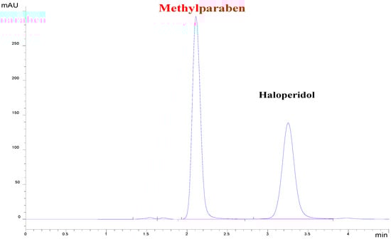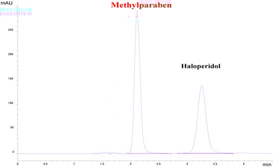 When the sample solution, prepared via the simple dilution of the finished product, was injected, two clear chromatographic peaks were observed: one at approximately 3.30 min, corresponding to haloperidol, and another at 2.11 min, representing methylparaben, as shown in Figure 4. These compounds were efficiently eluted and separated, with a resolution greater than 2.