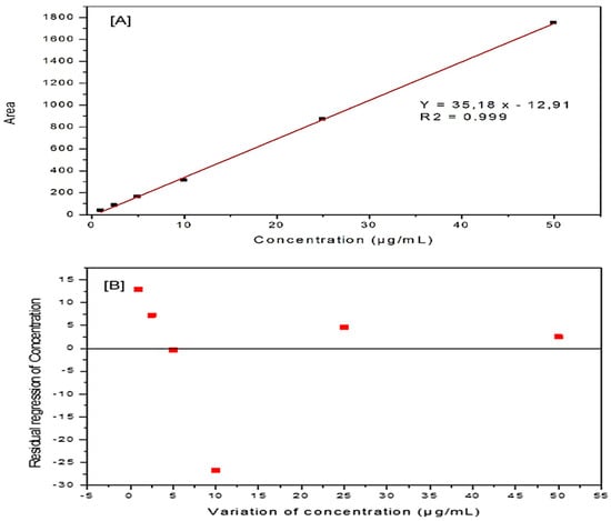 The calibration curve exhibited excellent linearity across the concentration range of 1.0–50 µg/mL, with a correlation coefficient (R2) of 0.999. The relative standard deviation (RSD) was consistently below 2%, demonstrating the method’s precision (Table S1, Figure 3A). Furthermore, the residual plot (Figure 3B) displayed a random distribution around the zero line, confirming the absence of systematic errors and aligning with ICH guidelines. This streamlined presentation focuses on the key findings, as requested by the reviewer, omitting repetitive methodological details.