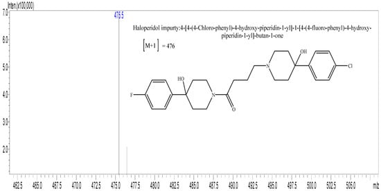 The mass spectra of the haloperidol degradation product formed under photolytic conditions are shown in Figure S8. Degradation signals were identified based on their mass-fragmentation patterns (m/z). Specifically, degradation product [B], resulting from photolytic stress, displayed multiple fragments, with the primary signal detected at m/z = 476. This analysis enhances our understanding of the photolytic degradation pathways of haloperidol and underscores the importance of ensuring proper storage conditions to preserve its stability.