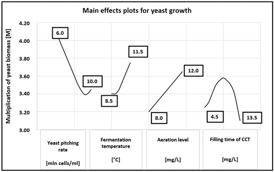 The main effects plot for yeast growth is shown in Figure 2. A linear relationship was observed between the yeast biomass multiplication factor (M) and the aeration level over the tested range. In contrast, the yeast biomass growth exhibited a second-order relationship with the CCT filling time, reaching a maximum at 9 h. Both lower and higher CCT filling times resulted in reduced yeast multiplication. A clear inverse relationship between the yeast multiplication factor and the pitching rate was observed up to 9.0 million cells/mL, whereas a fermentation temperature above 9.5 °C increased the yeast multiplication linearly.