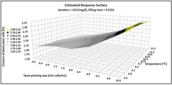 Figure 3 shows that as the dose of yeast increases over the experimental range, so does the number of dead cells. In turn, the increase in temperature in the range of 8.5–11.5 °C had no statistical significance and the percentage of dead cells was in the range of 3–3.5% for the yeast pitching rate from 6 to 10 million cells/mL.