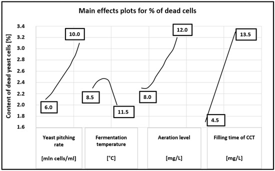 A more detailed distribution of the influence of the tested parameters on yeast mortality can be seen in Figure 4. The figure clearly shows that an increase in dead cells is observed throughout the tested range of the yeast dose, aeration level and filling time. It ranges from 2.15 to 3.1% for the yeast dose, from 2.3 to 3.2% for the aeration and from 1.6 to 3.3% for the filling time. There is no correlation in the whole tested range only for different fermentation temperatures.